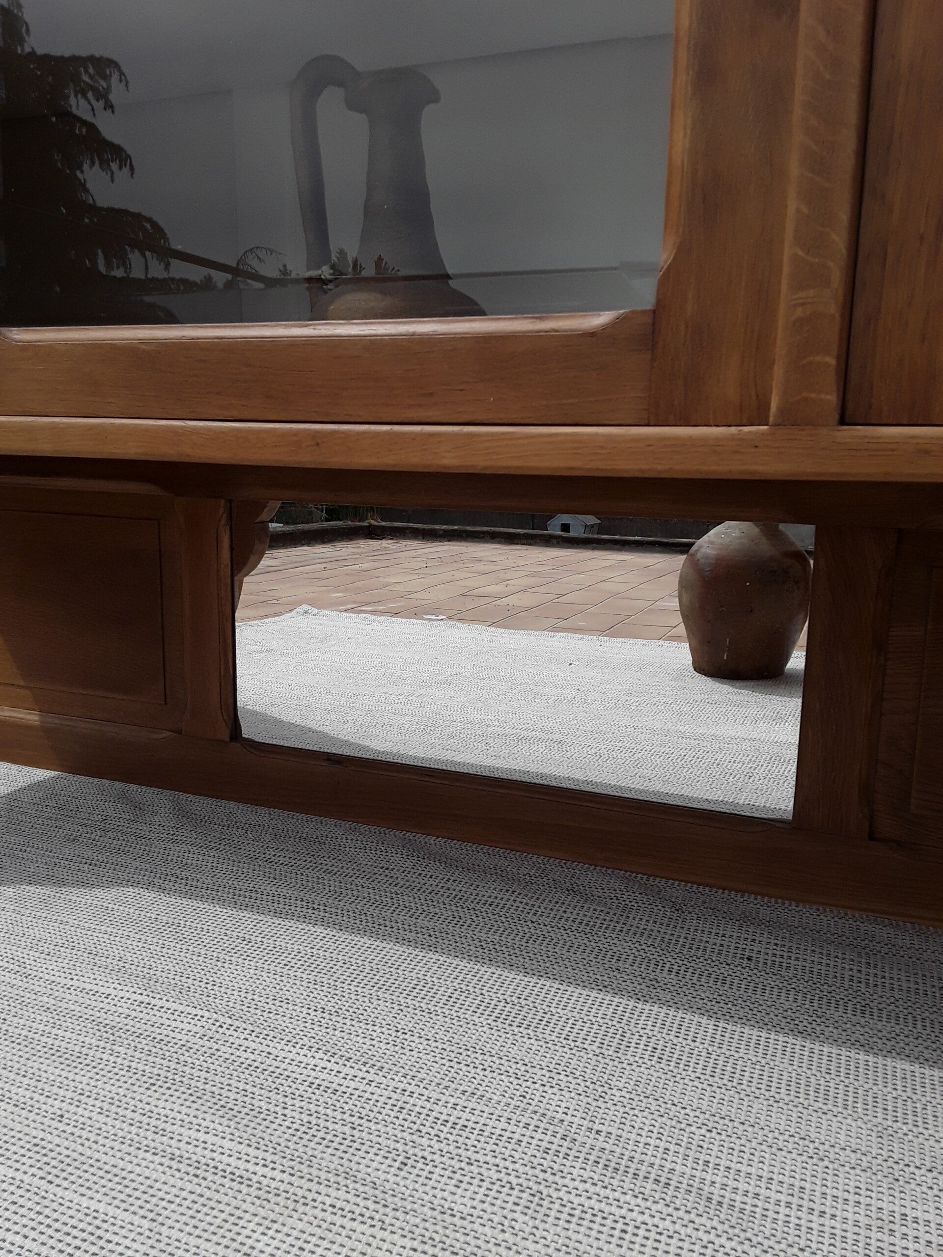 Le bois a été mis à nu à la main, par un ponçage fin et un travail méticuleux au grattoir dans chaque courbe des sculptures, afin de préserver la finesse originelle du chêne et la profondeur de ses fibres.
